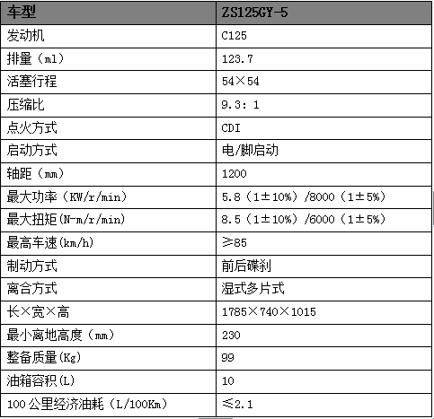 "锐酷(ZS125GY-5)"匹配轻巧车身,动力狂野、舒适易控。采用加大加粗后平叉,可调式气囊后减,真空前后轮,倒制前减震,前后花盘式制动,免维护电池,LED转向灯,前后碟刹,套色铝轮的整车完美配置。