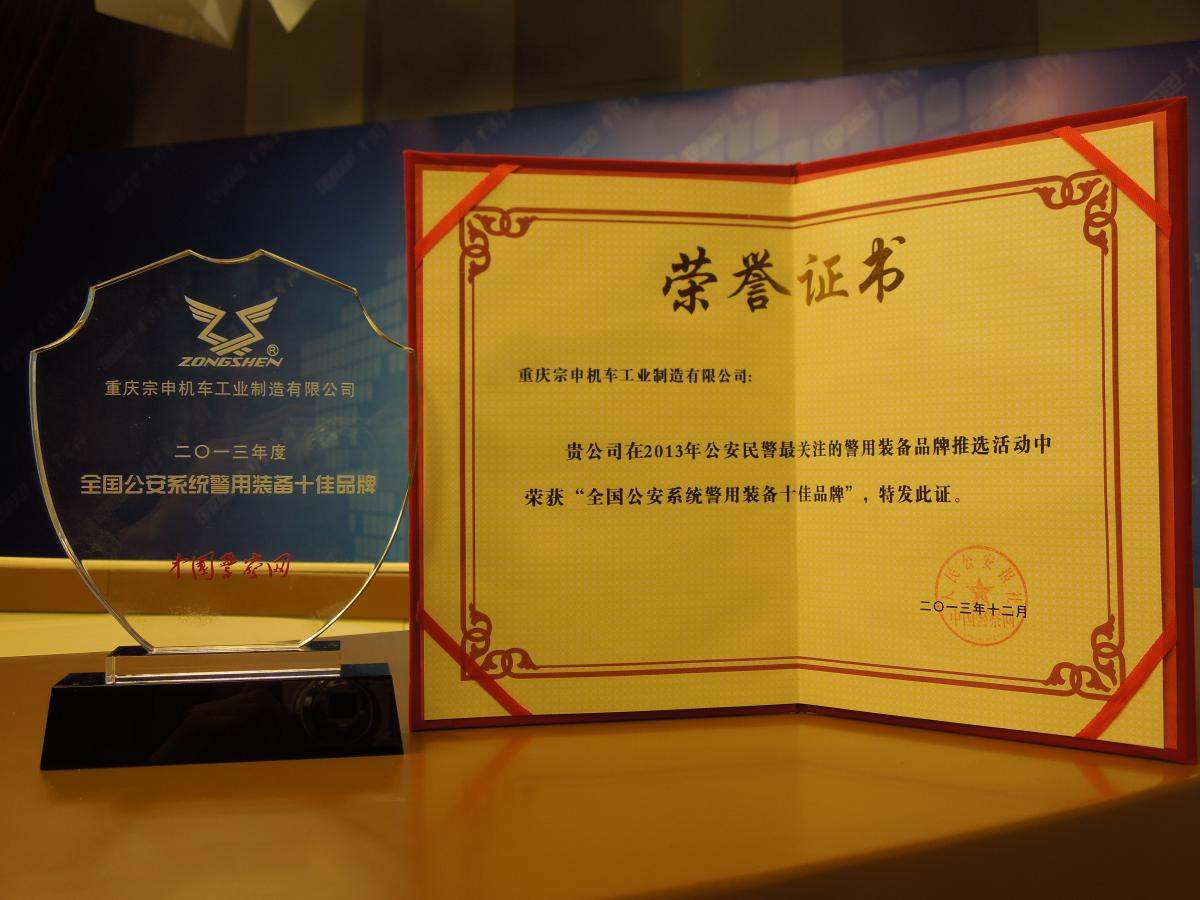 为进一步提升公安机关战斗力,切实满足公安民警对警用装备产品性能的应用需求,由人民公安报社、中国警察网主办的2013警用装备品牌发展研讨会于12月26日在京举行。届时,出席领导、专家、企业代表等共同对当前警用装备发展状况进行深入探讨,获奖企业领导出席颁奖仪式并领奖,获奖企业产品展示将为各级公安机关警用装备采购提供参考。其中,重庆宗申集团旗下警用摩托车产品——赛科龙RX3警用版,获得了“全国公安系统警用装备十佳品牌”称号。